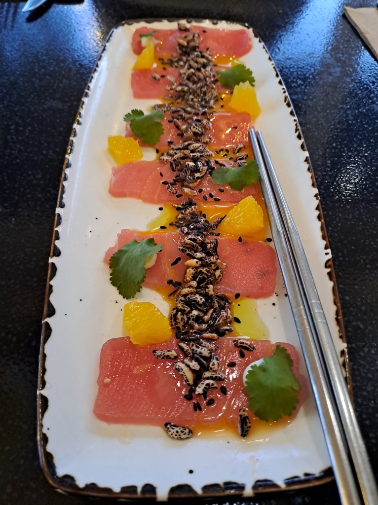 So we only scratched the surface at Rassasy and it’s due a return visit to enjoy more fully. We had more good food and service: we loved the beautifully presented yellowfin tuna sashimi with citrusy St Clements dressing, wasabi mayo and coriander; ditto the deeply flavoursome and earthy smoked eggplant hummus; and a stand-out plate of steamed vegan shiitake and water-chestnut dumplings with a Chinese-inspired sauce, spring onion, chilli threads and sesame.